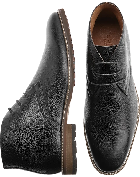 Simply styled, these plain-toe chukka boots have a lightly pebbled genuine leather upper, three eyelet lacing, and rugged, lugged outsoles.