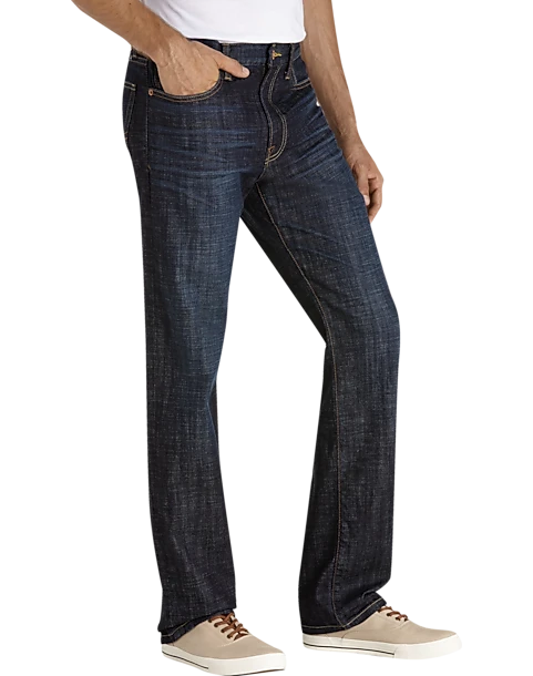 These Lucky Brand jeans feature a dark blue wash with whiskered details and classic five-pocket styling. Contrast stitching throughout and embellished back pockets complete their timeless look.