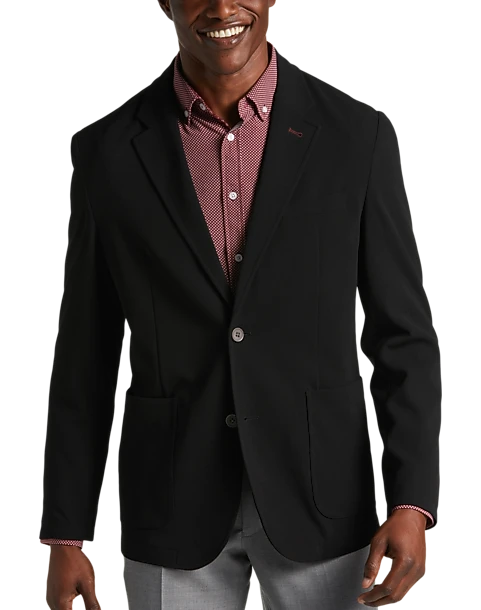 - 98% polyester 2% spandex|Notch lapel|Two-button closure|Patch pockets|Polyester blend crepe knit|Modern Fit|Michael Strahan|
